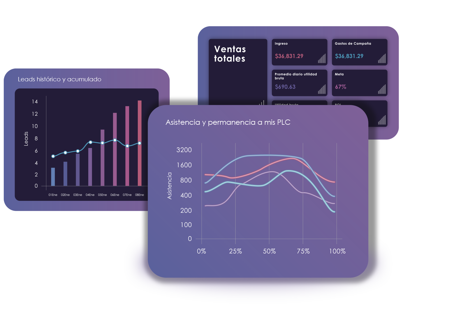 Módulo de la plataforma donde se presentan hallazgos de los cruces entre las bases de datos de las diferentes plataformas. Puedes saber qué prospectos vieron todos tus videos pero no compraron, qué prospectos llegaron al checkout y no pagaron, cuál es tu campaña con menor CAC (costo de adquisición de clientes), relación de ventas y registros generados por país.